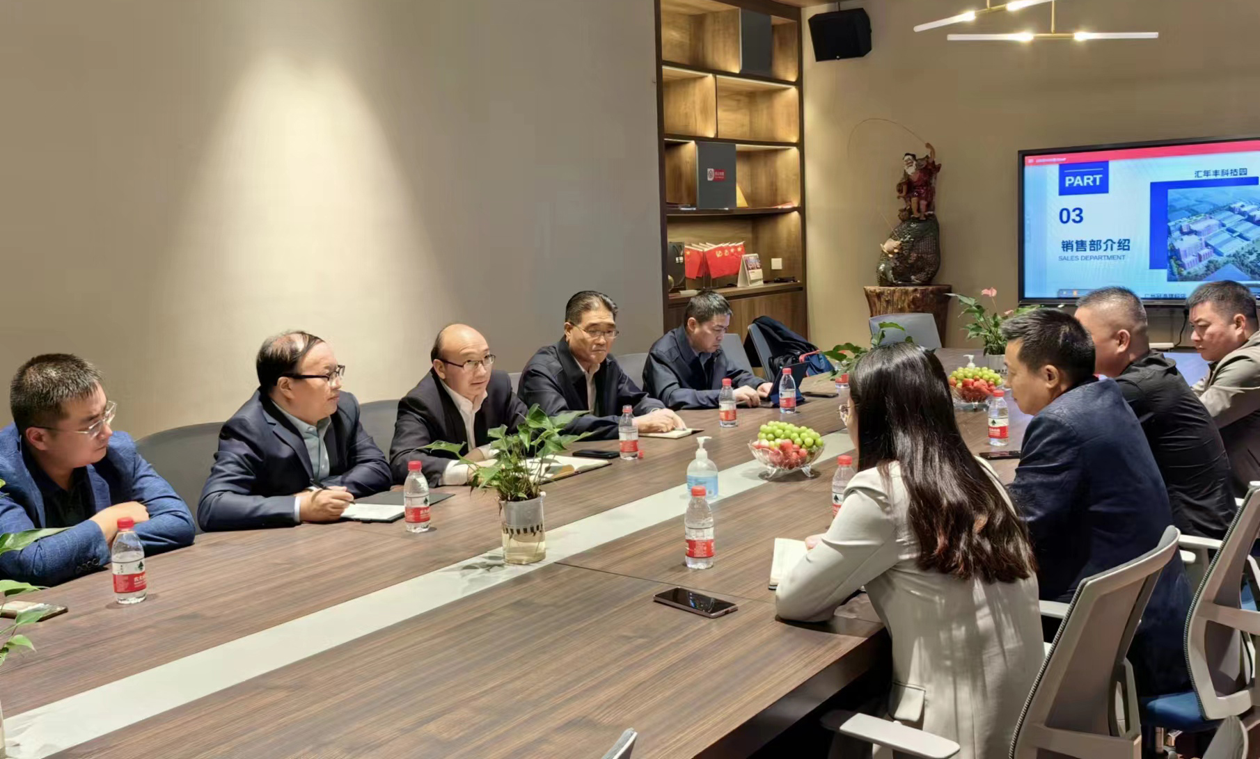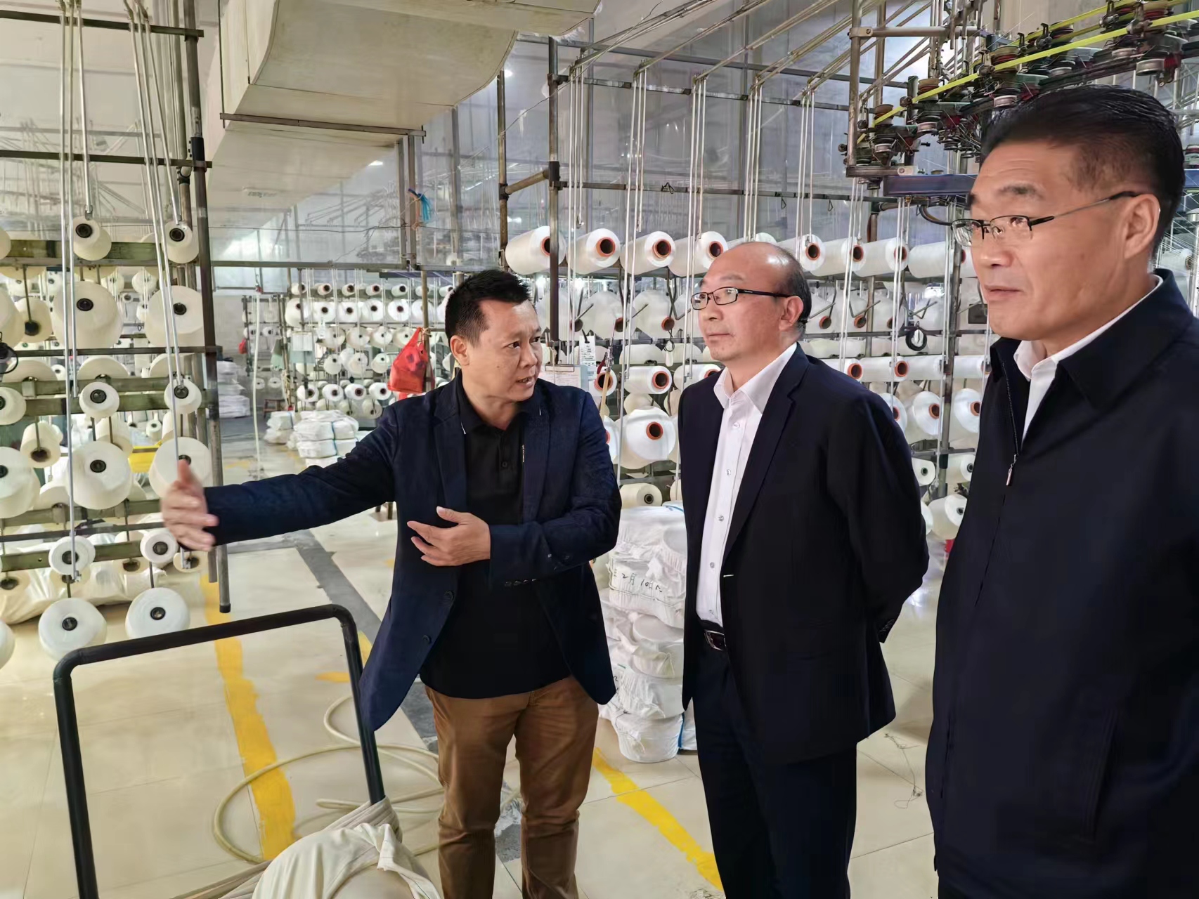 在汇年丰纺织公司,丁锐一行在陆汝针总经理的陪同下参观了该公司纺织生产线,并就产品定位、成本、质量及交期等有关情况进行了座谈交流。双方表示,工投集团与汇年丰纺织建立了良好的业务合作关系,希望下一步能够继续加深合作,扩大业务量。