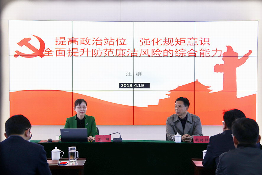 为进一步深入学习贯彻党的十九大会议精神,强化正风肃纪,不断巩固拓展落实中央八项规定精神成果,4月19日下午,集团公司纪委书记汪群在资产管理公司上了一堂《提高政治站位,强化规矩意识,全面提升防范廉洁风险的综合能力》廉政党课,该公司50多名干部职工聆听了党课。