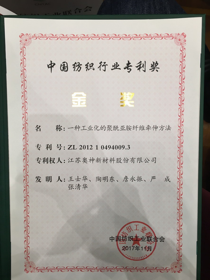 会上发布了首届中国纺织行业专利奖、全国纺织科技创新人才等评审结果,集团公司副总经理王士华获得“全国纺织科技创新领军人才”荣誉称号,并作为获奖代表上台发言。江苏奥神新材料股份有限公司发明专利“一种工业化的聚酰亚胺纤维牵伸方法”获得首届中国纺织行业专利奖金奖。