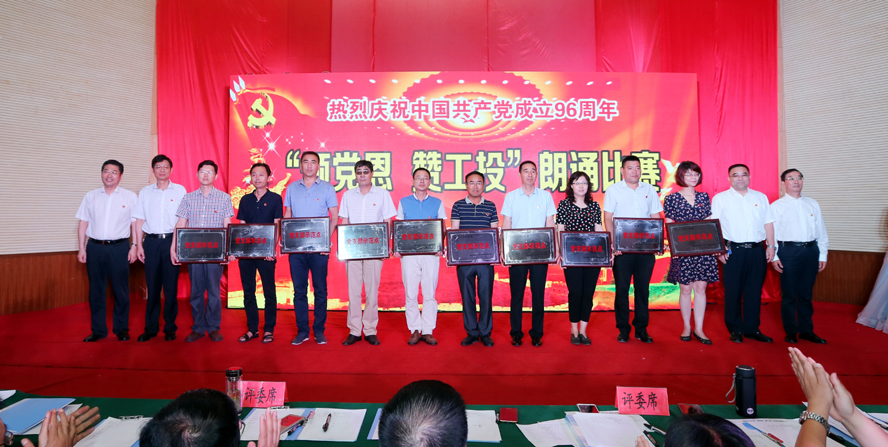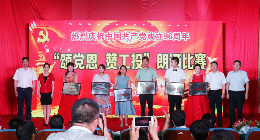 为庆祝中国共产党成立96周年,缅怀党的丰功伟绩,6月29日下午,集团公司党委在连云港职业技术学院文化艺术中心举办“颂党恩·赞工投”朗诵比赛,集团公司领导杨龙、胡建明、张其海、王士华、戴鸿鸣、汪群、匡友本、陈如军与来自集团公司各条战线的近三百名代表欢聚一堂,共同庆祝党的96岁华诞。