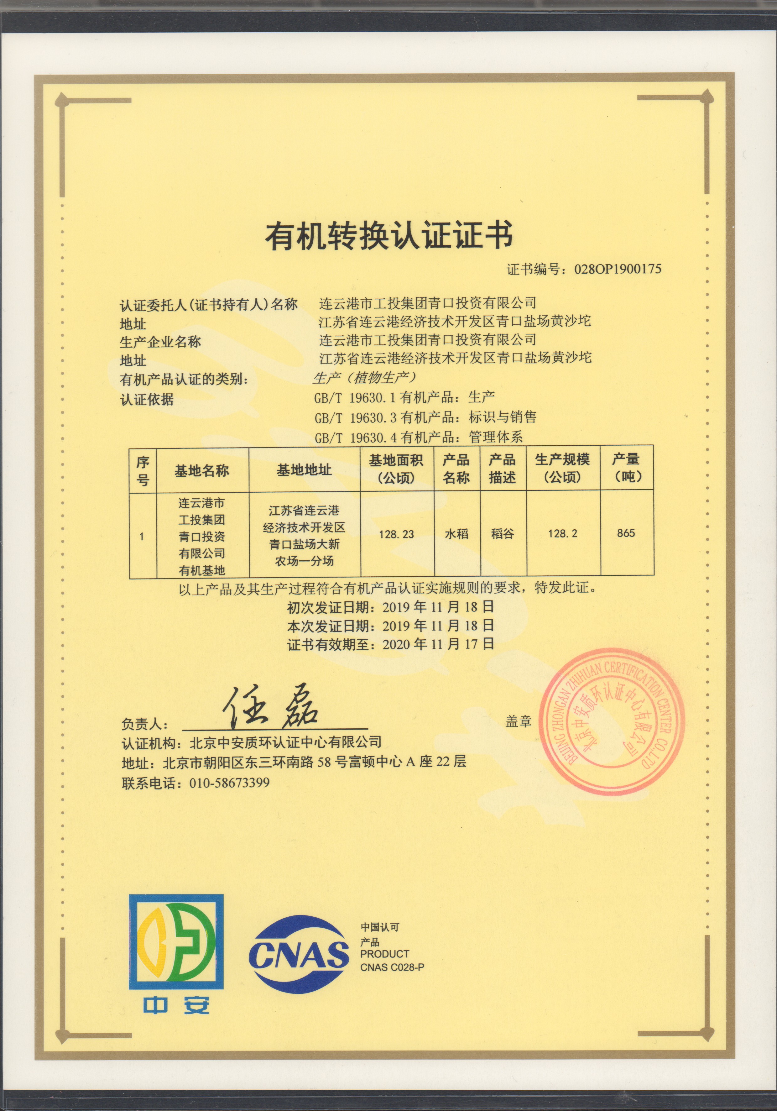 11月25日上午,青口投资公司种植的“南粳9108”有机大米经过严格的检测和审核,荣获北京中安质环认证中心颁发的有机转换认证证书。
