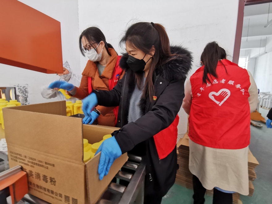 在得知美多利科创园入园企业永荣生物公司有一批紧急运往武汉的消毒粉订单,工人紧缺的信息,台北公司青年突击队第一时间奔赴生产现场,“发放、装车、运输”,分工合作,保证效率,确保产品及时发送,助力战“疫”一线。
