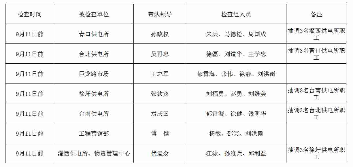 公司2019年双节前(中秋、国庆)安全大检查日程安排