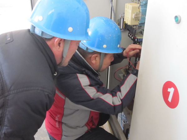 图为工人们在进行现场检查 针对青口盐场扬水工对开关柜工作原理了解甚少的情况,青口供电所利用时下正值扬水淡季之机,主动到泵站现场,为扬水工详细讲解开关柜的工作原理,并对开关柜是否存在隐患进行检查。(宋中文)
