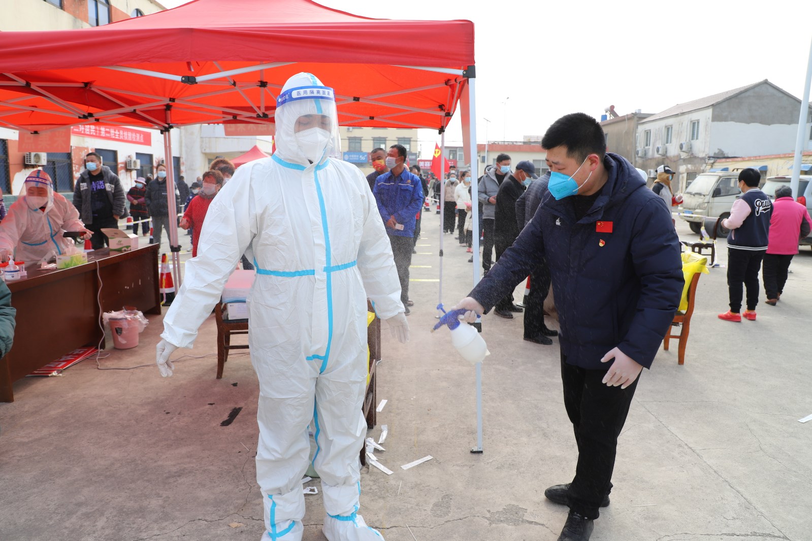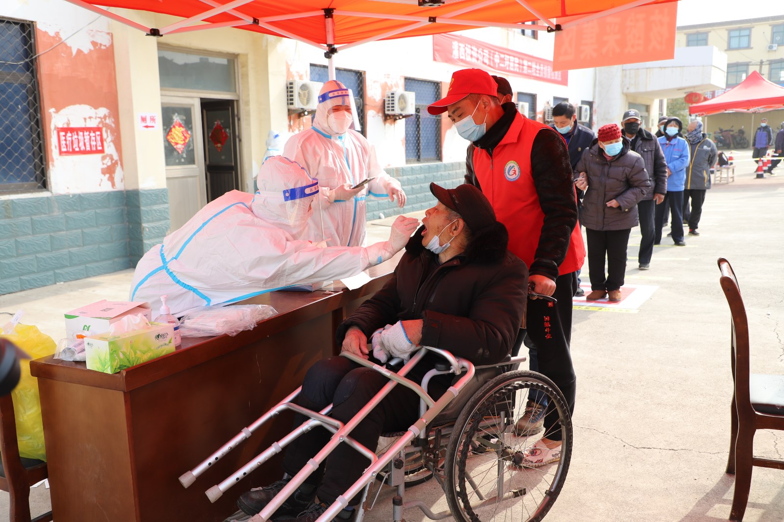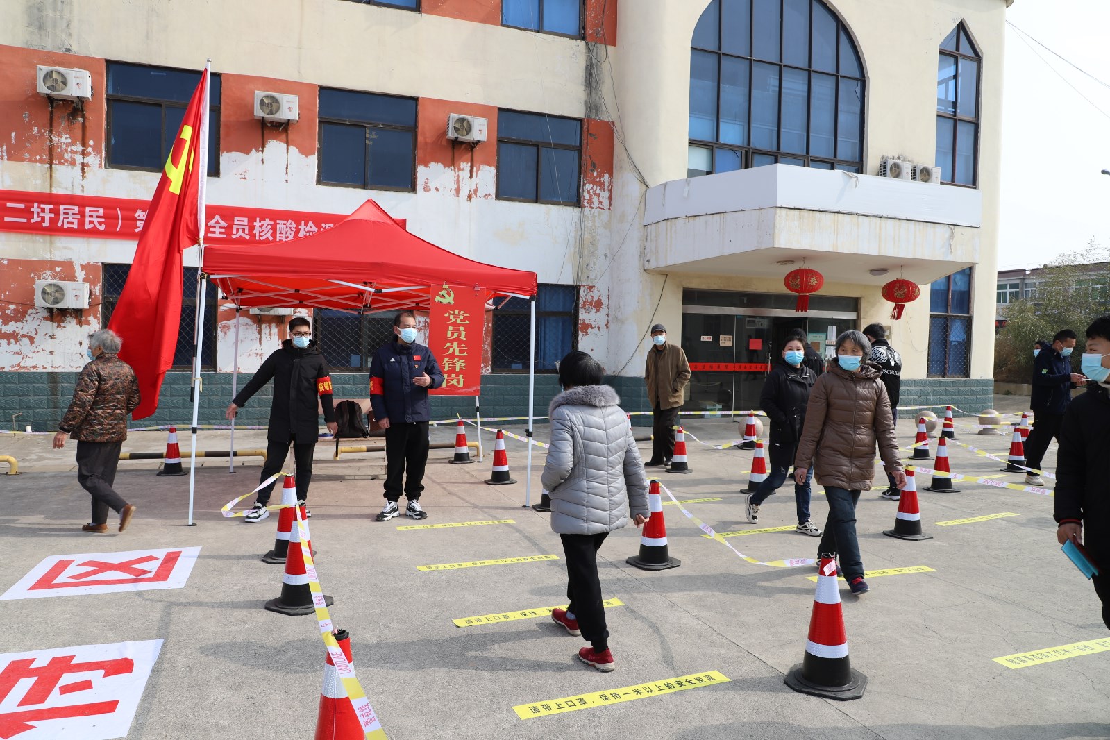 检测现场,各单位组织党员先锋队成员、社区志愿者不断优化现场服务,提醒居民群众提前出示“苏康码”,有序排队,让等待时间更短一点、人员距离更远一点、个人防护更好一点。另一方面,灌西检测点开设老者、孕妇、儿童绿色通道,减少这部分人群排队等候的时间,同时安排志愿者搀扶、帮助不会使用智能手机的老年人,确保他们顺利完成核酸检测。
