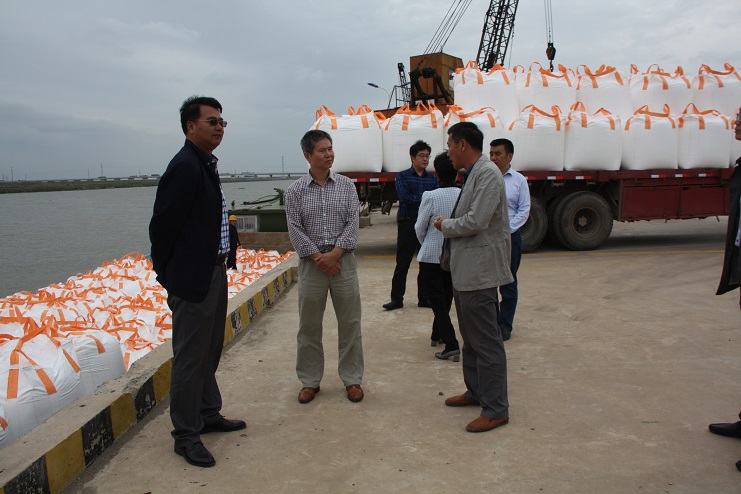 在五灌河码头现场,宵洋物流公司工人正忙于装卸作业,将车辆上化工产品吨袋物资吊装下船舱,喻振东副局长一行首先到码头现场视察码头的生产建设情况,随后到投资公司三楼会议室进行了座谈。