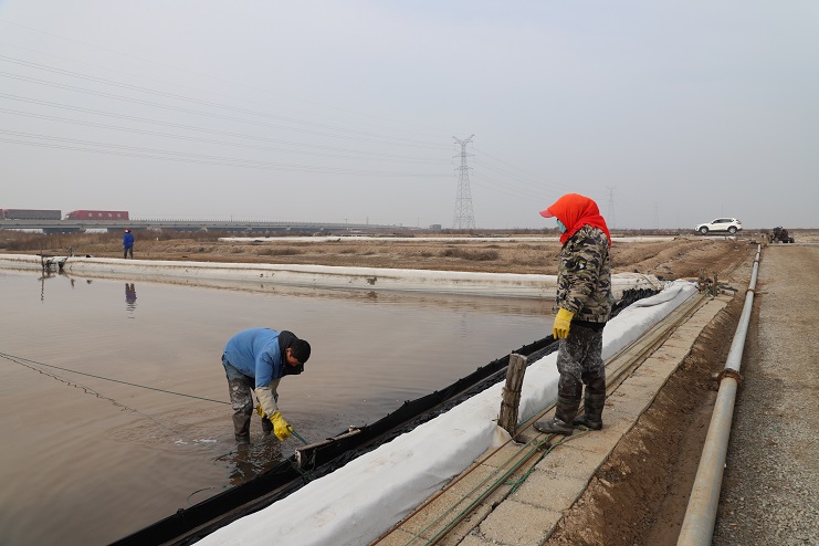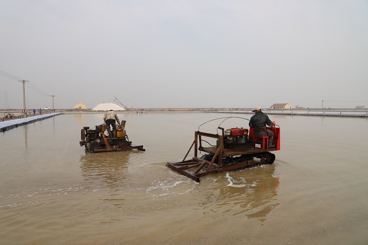 2月27日,我们在日晒制盐公司生产一线看到,一大清早,工人们就开始在盐滩上忙碌着,为因气温较低而暂时停止的扒盐工作做好各项开机前的准备工作,确保扒盐、生产两不误。