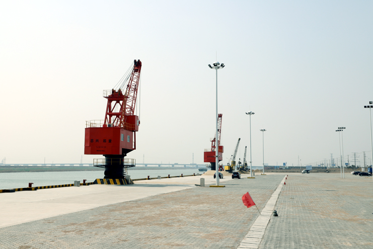 在五灌河码头现场,302米长的码头平台上,2座20多米高的红色座吊一字排开,在河水的映照下显得格外“威武”。据码头工作人员介绍,这两座吊机刚刚安装并调试完毕,它们是五灌河码头运营的最基本条件之一,一座25吨,另一座40吨,运出货物将通过这两座吊机完成。