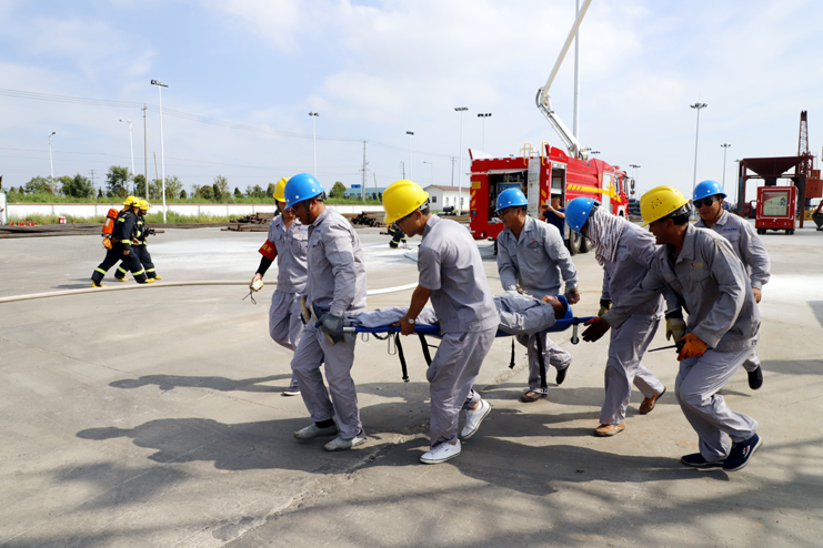 此次演练模拟电器短路和起火事故开展应急救援。码头现场吊机在操作中发生主电机电流过载,配电箱出现异常,吊机作业操作无法正常工作,主机发出报警,吊机刹车系统出现失灵,电器设备出现故障,继而发生初期电火,报警信号发出后30秒内该区域内所有人员疏散完毕,并拨打119火灾救援电话,并迅速遏制火情,扑灭火灾,有效保护在场人员人身安全及公司财产安全。整个演练过程,参演员工严格按照应急预案要求,积极配合,有序、迅速地完成疏散及灭火等演练任务,人员及财产得到了有效保护,演练达到了预期效果。