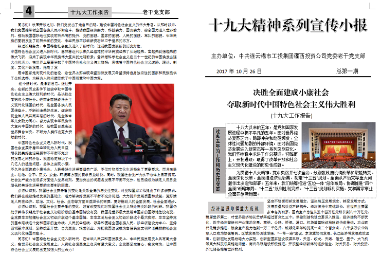 10月27日,灌西投资公司党的十九大精神第一次学习会议上提出五确保,即确保学习入脑入心;确保领会认真准确;确保宣传宣讲生动;确保十九大结合实际;确保干好当前。在投资公司党委的带领下,老干党支部掀起了学习贯彻党的十九大精神的热潮,重在学懂、弄通、做实上下工夫。
