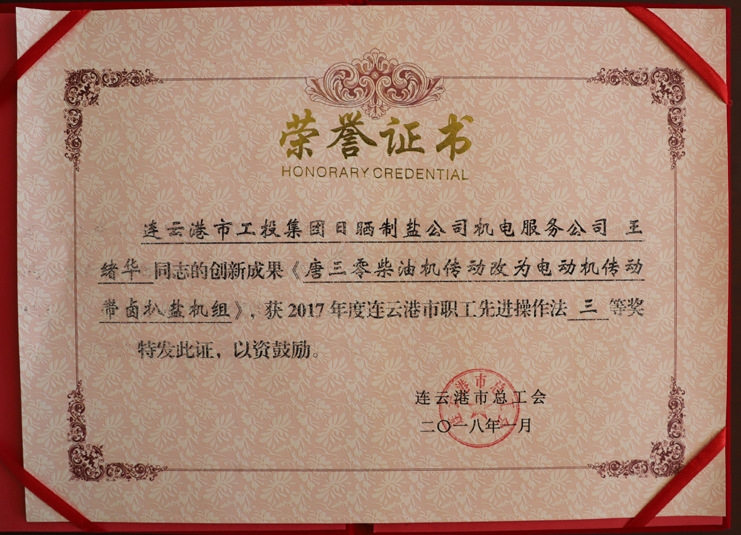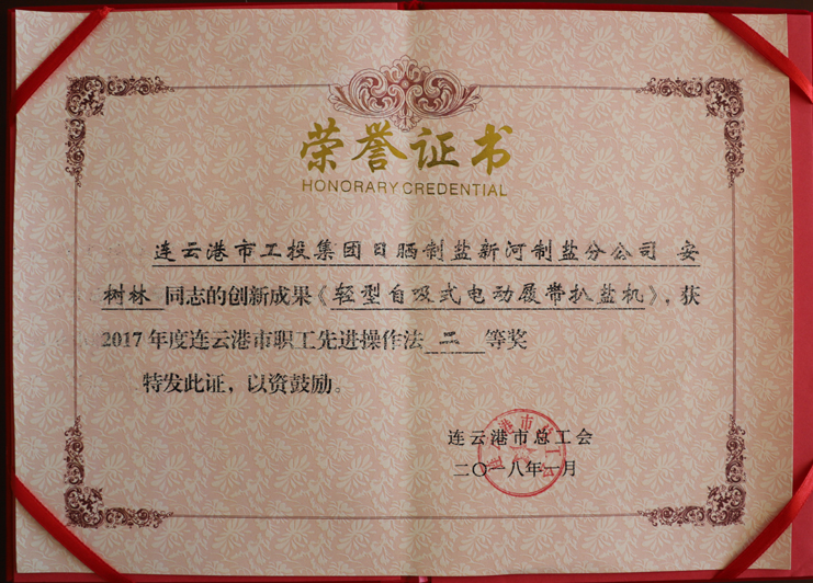 近日,日晒制盐新河制盐分公司安树林同志的创新成果《轻型自吸式电动履带扒盐机》,被市总工会评为2017年度连云港市职工先进操作法二等奖,日晒制盐公司机电服务公司王绪华同志的创新成果《唐三零柴油机传动改为电动机传动带卤扒盐机组》,被市总工会评为2017年度连云港市职工先进操作法三等奖。(西工)