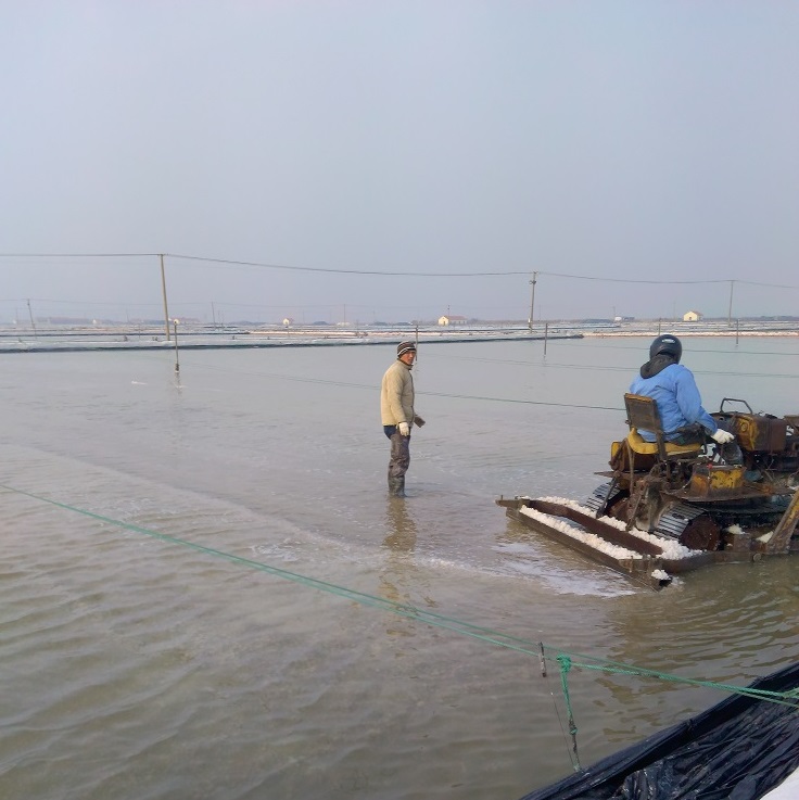 埒南制盐分公司抓紧做好池盐破碴工作,为即将开始的春季扒盐作好准备,利用5台唐30对去年下半年未参加扒盐的格块进行机械破碴,目前已经破碴70%以上。图为职工利用唐30在池内破碴。(埒宣)