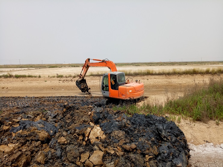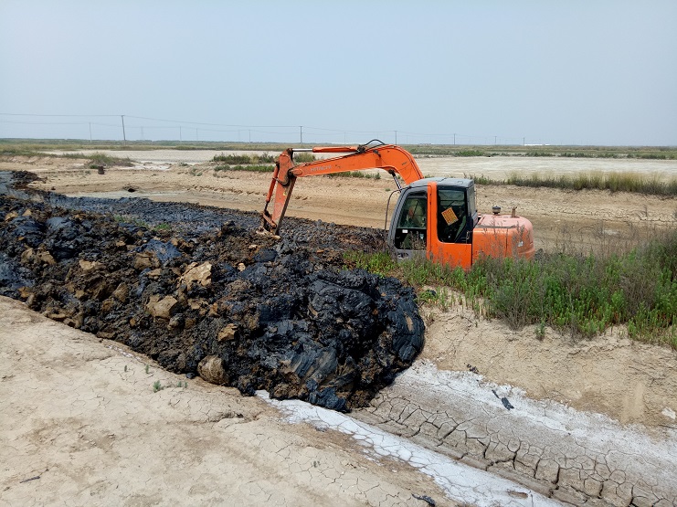 海盐基地一班班组近日对土塘进行清淤改造。两台挖掘机顶着连日来的高温天气连续工作。现该班班组的三排土塘清淤改造工作基本完成。(实业公司)