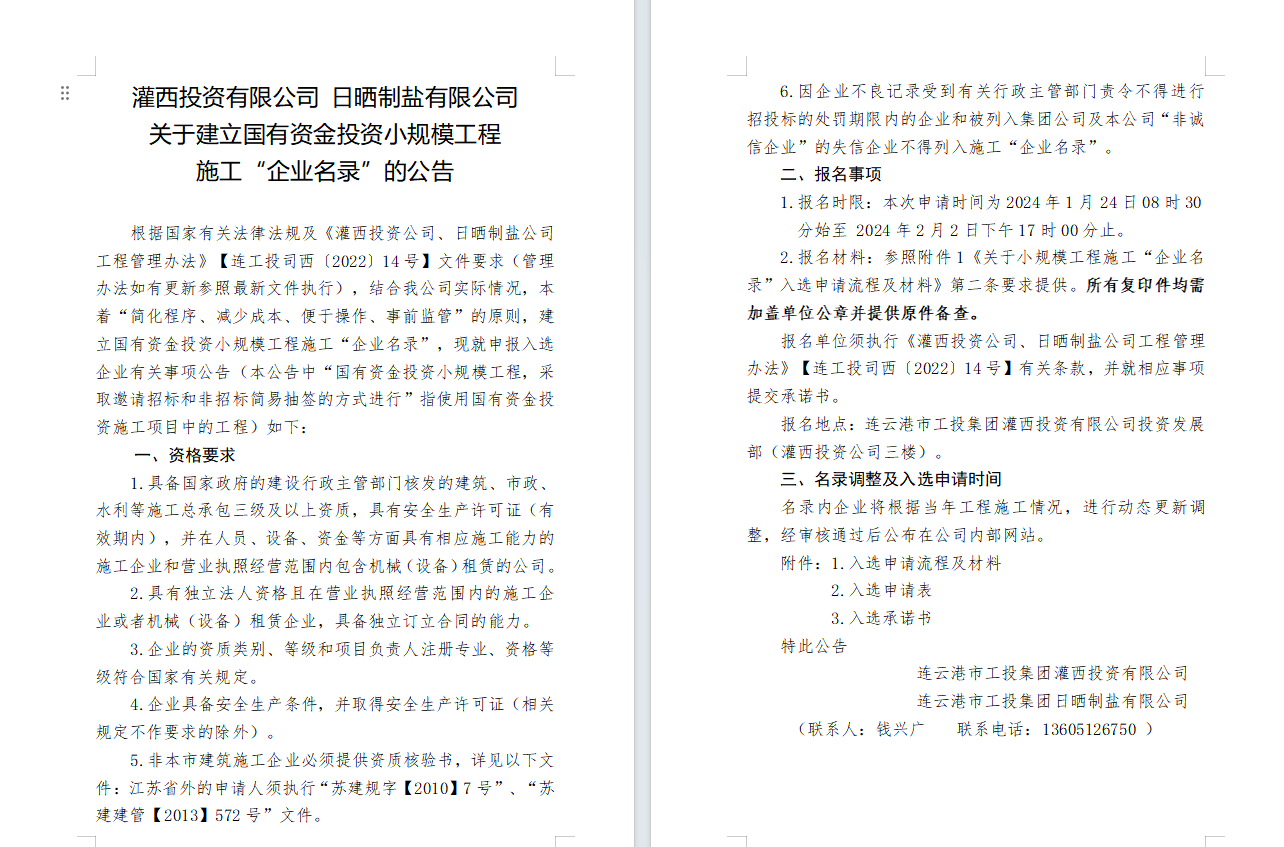灌西投资有限公司日晒制盐有限公司关于建立国有资金投资小规模工程施工“企业名录”的公告