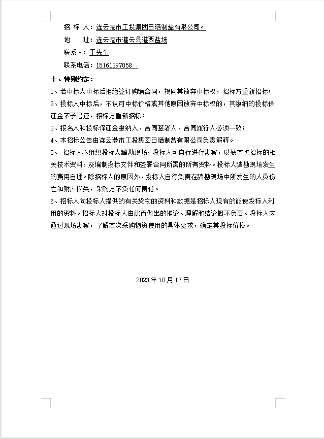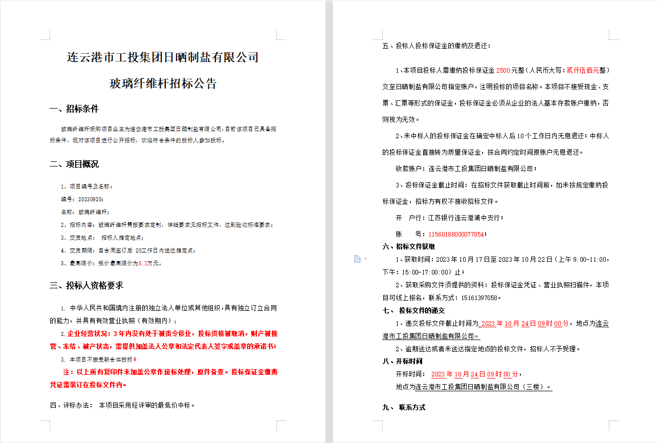 连云港市工投集团日晒制盐有限公司玻璃纤维杆招标公告