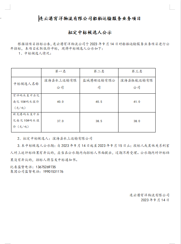 连云港宵洋物流有限公司船舶运输服务业务项目拟定中标候选人公示
