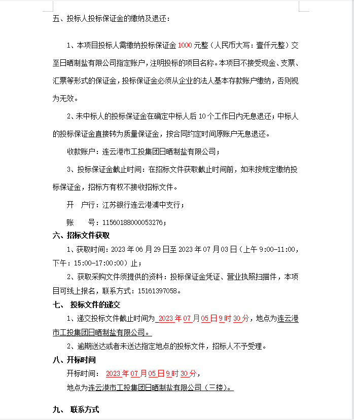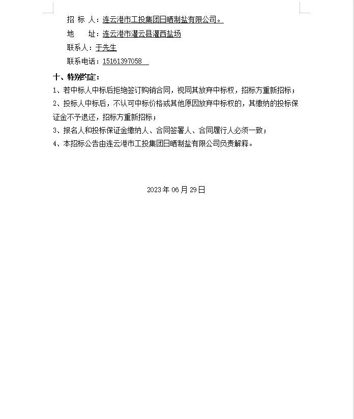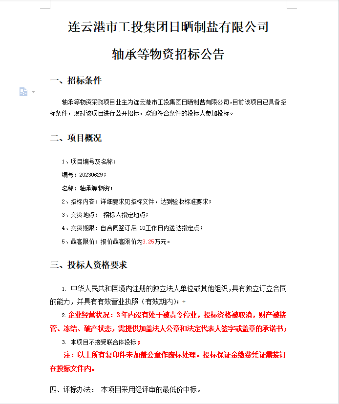 连云港市工投集团日晒制盐有限公司轴承等物资招标公告