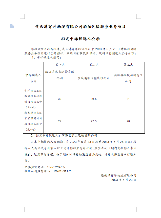 连云港宵洋物流有限公司船舶运输服务业务项目拟定中标候选人公示