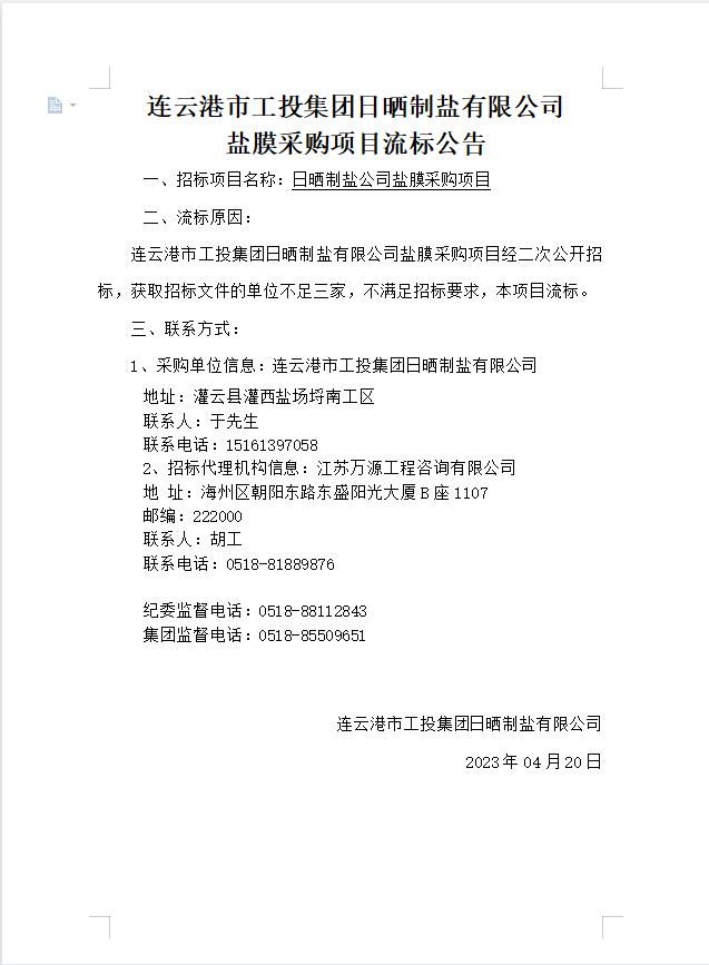 连云港市工投集团日晒制盐有限公司盐膜采购项目流标公告