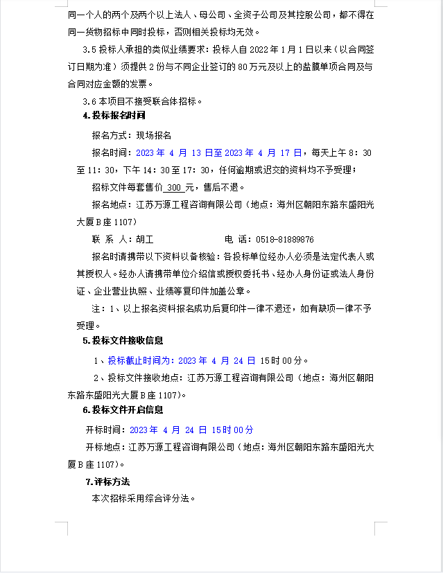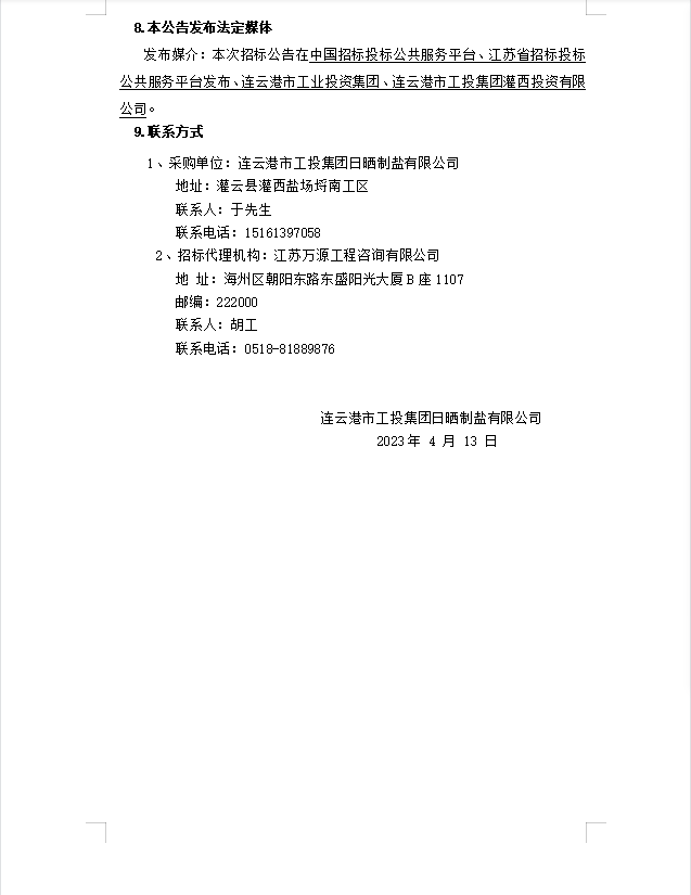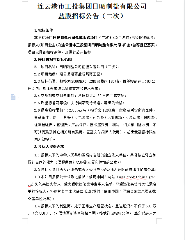 连云港市工投集团日晒制盐有限公司盐膜招标公告(二次)
