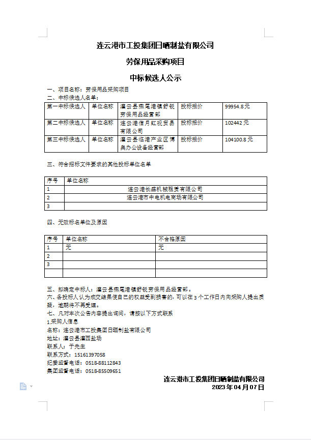 连云港市工投集团日晒制盐有限公司劳保用品采购项目