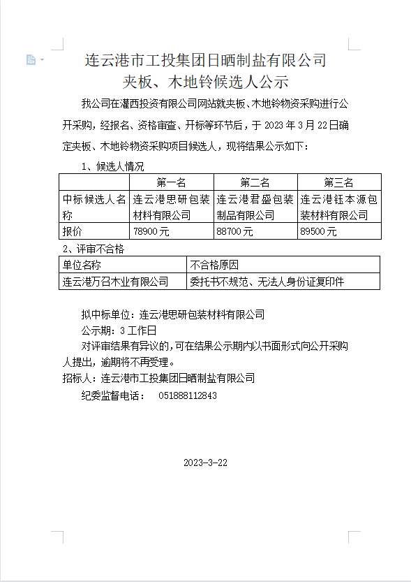 夹板、木地铃采购候选人公示