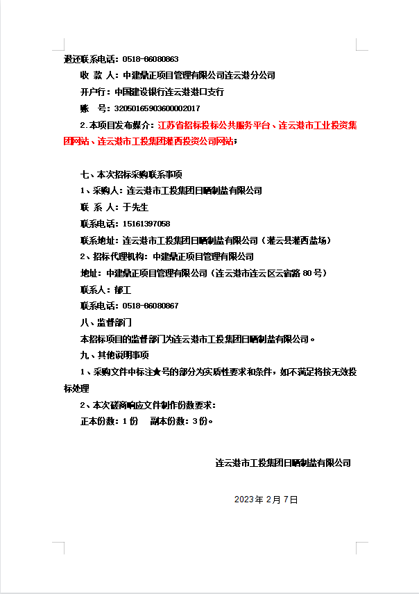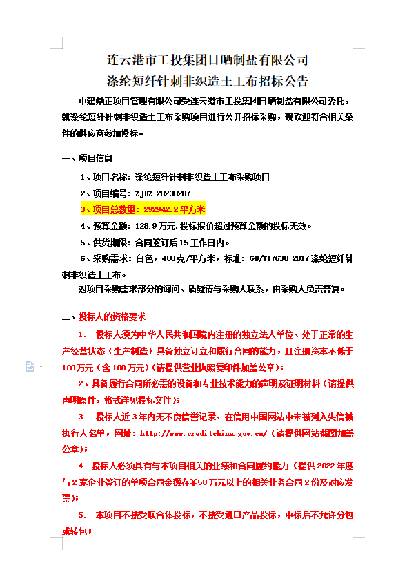 连云港市工投集团日晒制盐有限公司涤纶短纤针刺非织造土工布招标公告