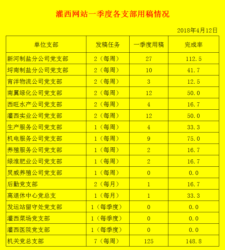 灌西网站一季度各支部用稿情况