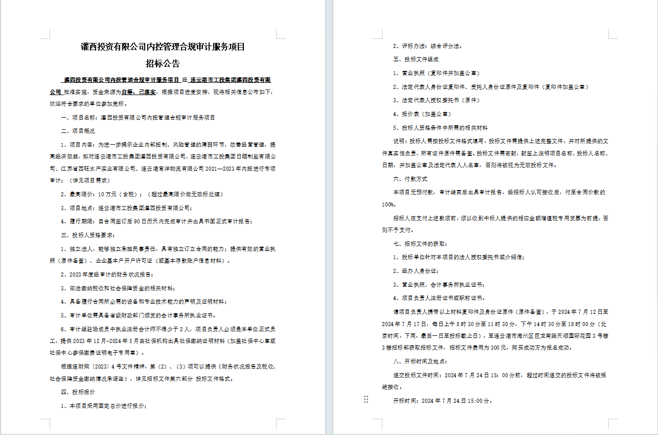 灌西投资有限公司内控管理合规审计服务项目招标公告