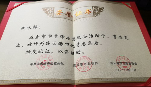 参加疫情防控志愿服务以来,朱咏梅一天都没有休息,已为超过2万名旅客检测体温。由于事迹突出,在全市学雷锋志愿服务活动中,被评为连云港市优秀志愿者。工作期间,渴了不敢喝水,饿了就吃泡面,虽然很辛苦,但是她觉得很自豪,她说:“我是一名预备党员,也是一名国企职工,比起那些奋战在疫情防控一线的医务人员,我做的太少了;当前,全国人民都投入到新冠肺炎疫情防控工作中来,我只是为防控工作贡献了自己的微薄的力量,我相信只要我们团结一心、众志成城,就一定能早日战胜疫情,早日打赢这场没有硝烟的战争!(凌家佳)