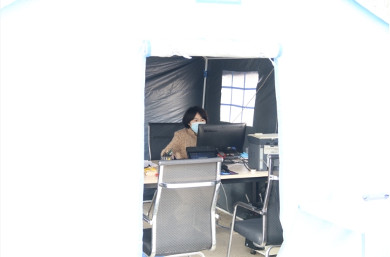 4月6日,工投金融板块复工的第一天,来办理业务的人员发现,公司院内树立着一顶崭新的帐篷,电脑、桌椅、打印机等办公设备放置其中,酒精、免洗液、口罩等防疫物资摆放在帐外醒目位置。 这是工投金融板块为保证疫情期间疫情防控与业务服务两不误,专门打造的特色“防疫业务服务窗口”。 正值疫情期间,而金融板块的业务涉及面广,流程严谨,尤其是窗口业务所涉及的签字、盖章等环节都需要与外来人员面对面现场办理,如何化解因疫情而产生的业务开展难题,就成为摆在金融板块干部职工眼前的一大问题。