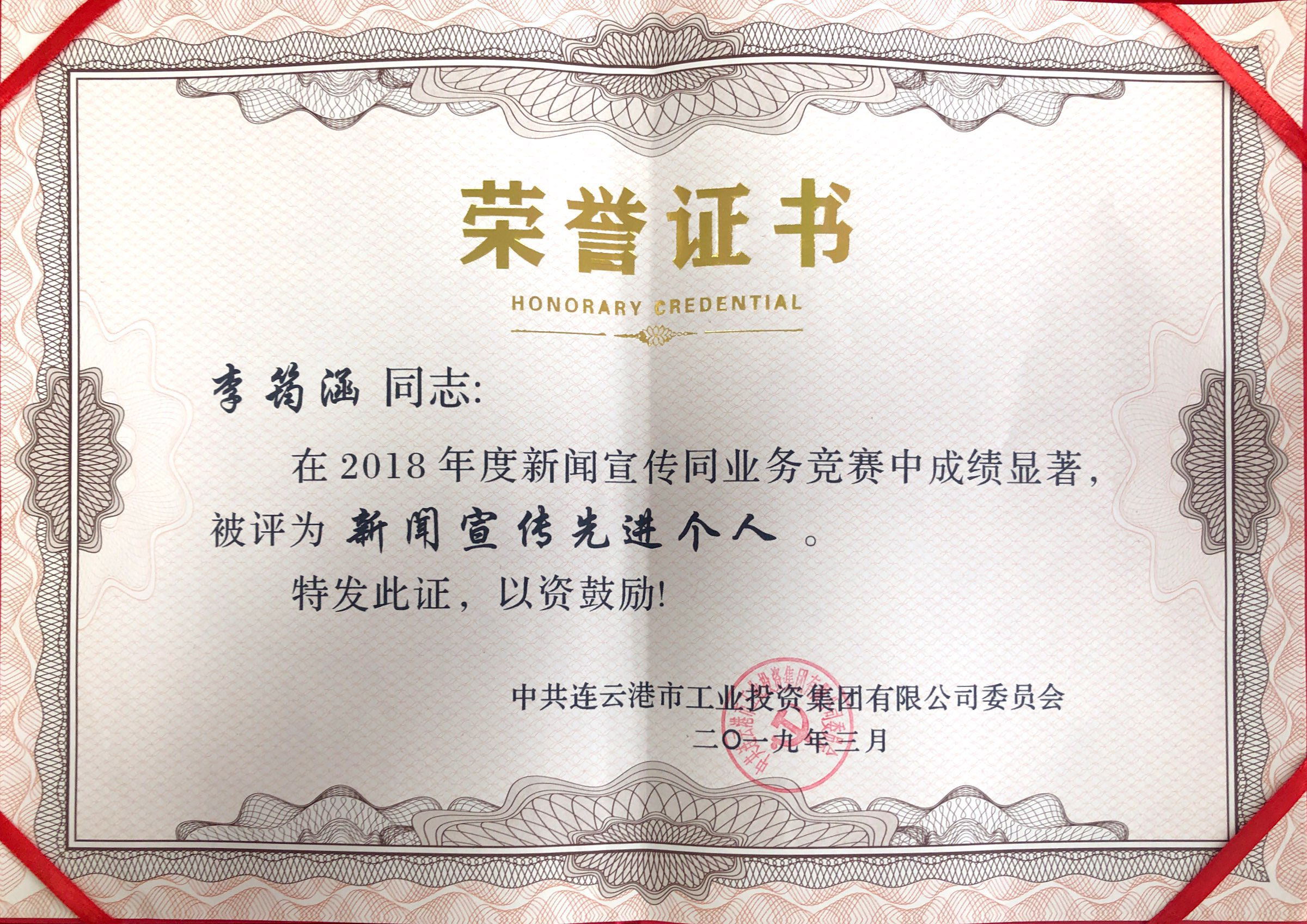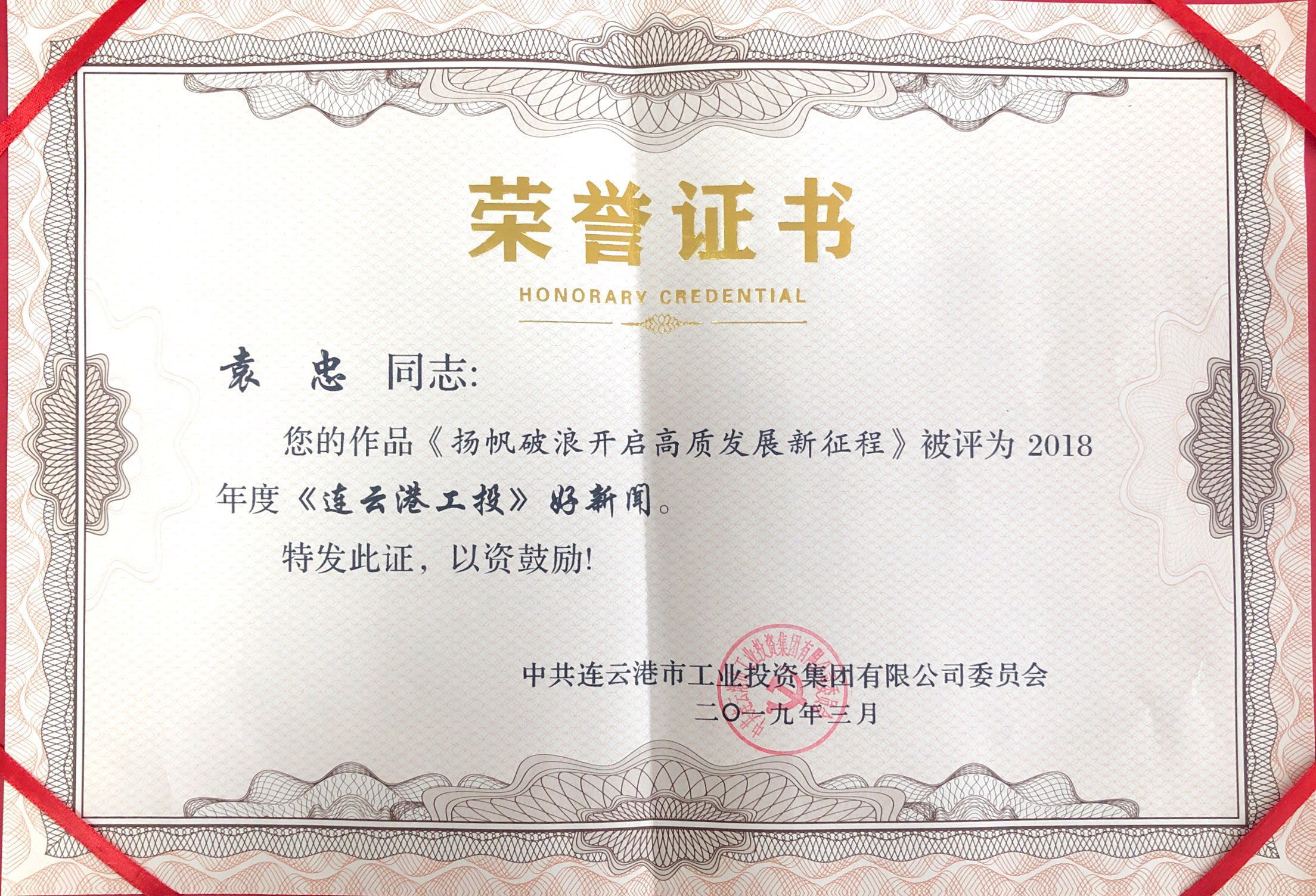 3月15日下午,集团党委召开了“聚焦高质高效,聚力创新创优”党内主题教育实践活动部署推进会。会上,我公司被评为“2018年度新闻宣传工作先进单位”;党支部副书记袁忠所著评论文章《扬帆破浪开启高质发展新征程》,入选“2018年度《连云港工投》好新闻”;李筠涵获得“2018年度新闻宣传工作先进个人”称号。