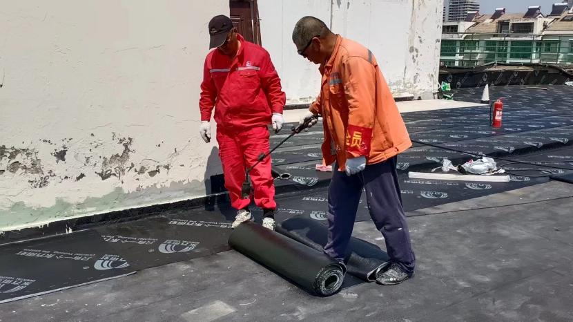 在昌圩湖大酒店楼顶防水工程施工现场,因屋面漏水严重影响酒店日常经营。为了赶在雨季来临之前完成全屋面防水工程,节日期间,有着“台北防水第一人”称号的丁祥生班长带领班组成员连日奋战在施工现场。随着喷枪烘烤着雨虹防水卷材,一米米的铺设前进不断缩短着距离。