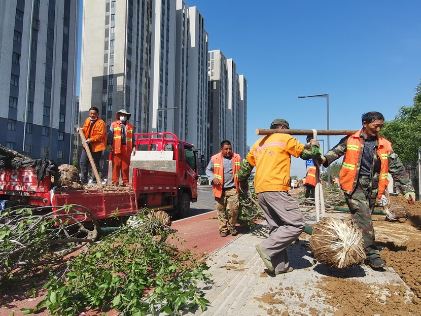 在中科院,只见工程车辆来来往往、橙色身影忙忙碌碌……到处都是一派繁忙、红红火火的景象。闯将孙玉虎,虎将金华穿梭在工程现场,亲自指挥调度绿化工程收尾工作。大家分工有序:定点划线、搬运苗木、栽植浇水、垃圾清理……有条不紊。中午时分,炽热的阳光照在脸上也是火辣辣的,忙碌了一上午的工人大汗淋漓,拧开瓶盖,咕噜咕噜喝了几大口凉水,用袖子蹭了下额头的汗,又干劲十足地投入到工作中。