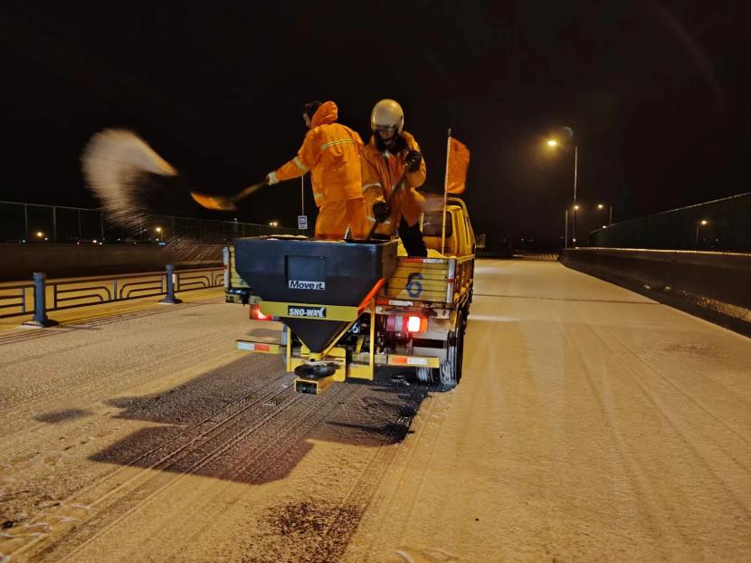 当晚,按照“即下即清、先通后净、保障通行”的清雪除冰原则,在统一调度下,一台台清雪设备有序穿行于道路上,撒布机打头阵,推雪板车紧随其后,将路面积雪进行打通,地上的雪从前向后逐次被清雪车辆推向道路边缘。随后,由人工加以配合,在人机结合方式下,冰雪被装到车上清运走。
