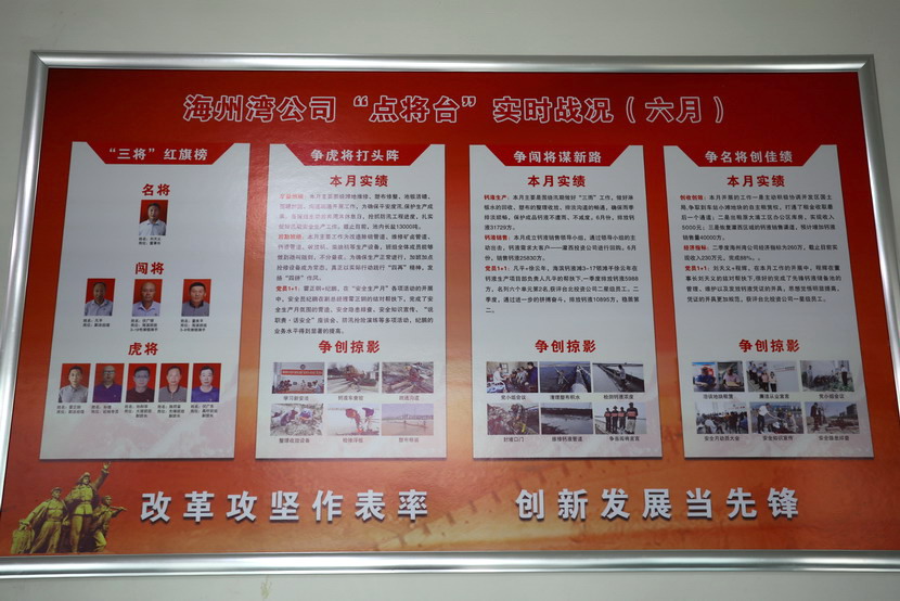 与会人员边看边听讲解海州湾党支部规范化展板和本月书记项目的落实情况,以及在海州湾党建活动室观摩学习了上半年党建基础台账和活动影像。各党支部就基层党组织规范化及书记项目“点将台”的落实情况作了汇报交流。党委副书记杨善革针对各支部的党建工作情况作了详细的点评,指出各支部党建工作中存在的不足,并要求各支部立即整改。