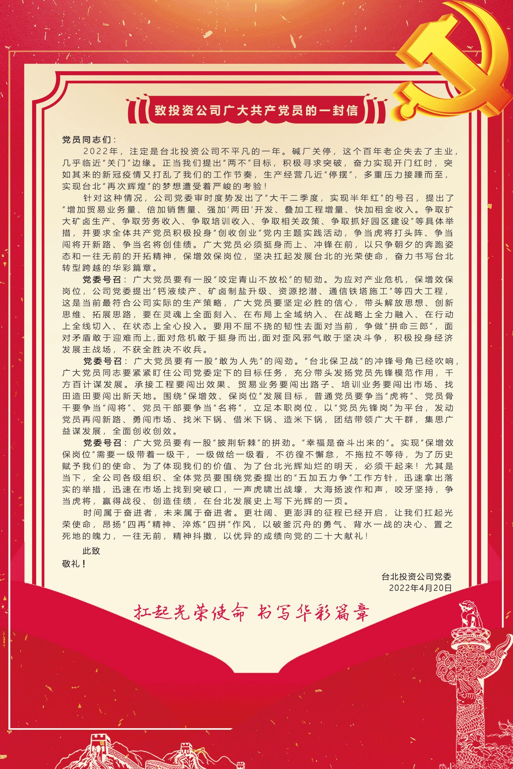 扛起光荣使命 书写华彩篇章——致投资公司广大共产党员的一封信