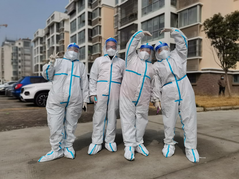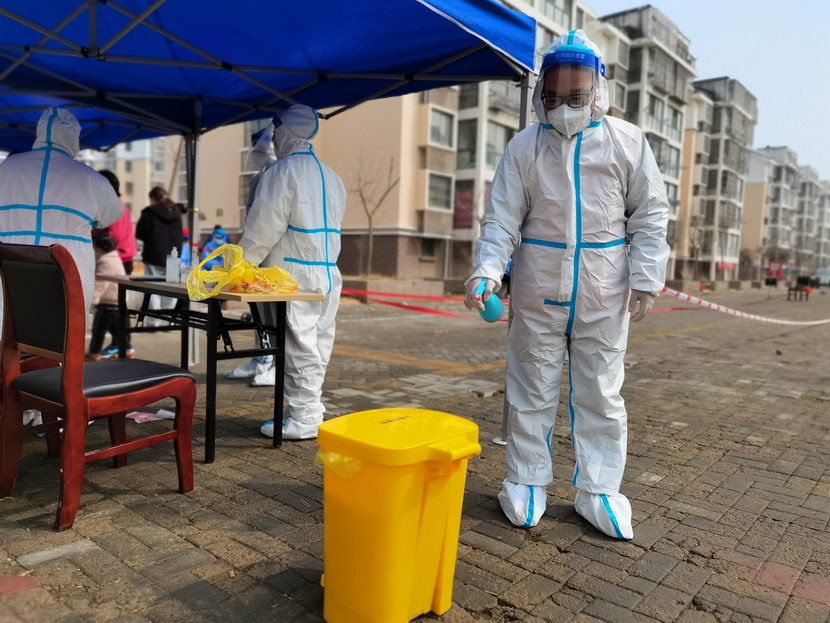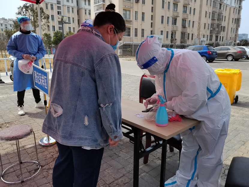 清晨6点30分,1号检测点,李明同志在检查物资,“大白”服装4套、“小蓝”服装6套、棉签600根……;2号检测点,于洪亮在将物资上桌,病毒核酸检测试管、棉签、消毒液,“还缺少一瓶酒精,我立即反馈给社区,请社区抓紧安排送来”;4号检测点,苏玲、秦黎明正在互相帮忙穿好防护服,“秦姐,这个防护面罩里外有两层薄膜,我给你撕掉,这样就不会有雾气了”,“嗯嗯,你这个拉链得拉到顶,我们自己也一定要做好防护”秦黎明温柔的说;5号检测点,内退党员孙芳和姜海洋,互相在防护服后背写上对方的名字,以便于更高效的完成检测工作;6号检测点,霍正钢、朱文健、韩永刚、邱荣滨正在清点检测小卡片;7号检测点,张强在拿着酒精给废物处置垃圾箱消毒;8号检测点,新加入的孙银、占恒春、尹永明、韩永光、赵绍庆正在给消杀喷雾剂灌装84消毒液,社区8个检测点的消杀工作全部由昌圩临时党支部志愿者负责。