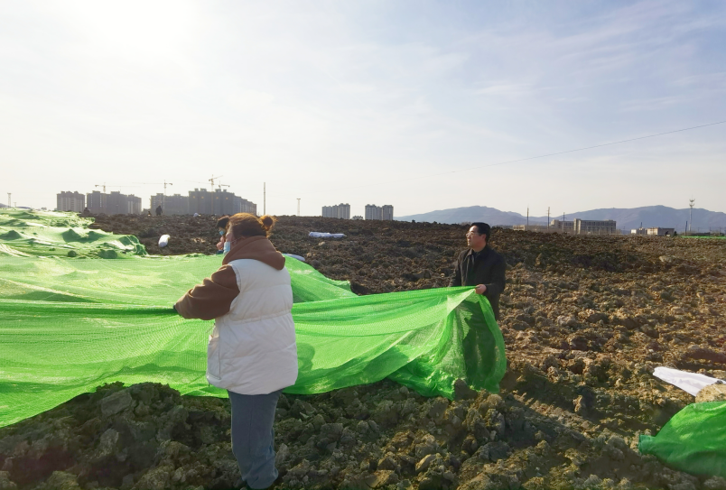 寒冷丝毫没有降低大家的热情,路面因为每天喷洒防尘导致潮湿泥泞,大家穿上雨靴,爬上爬下,一鼓作气,经过两天齐心协力的辛勤劳作,防尘网终于覆盖完毕。远远望去,覆盖绿网后的区域如同覆盖了一片绿色植被。此次绿网覆盖行动,不仅抑制了二次扬尘污染环境,保护了生态环境,同时达到了环境美化的效果。