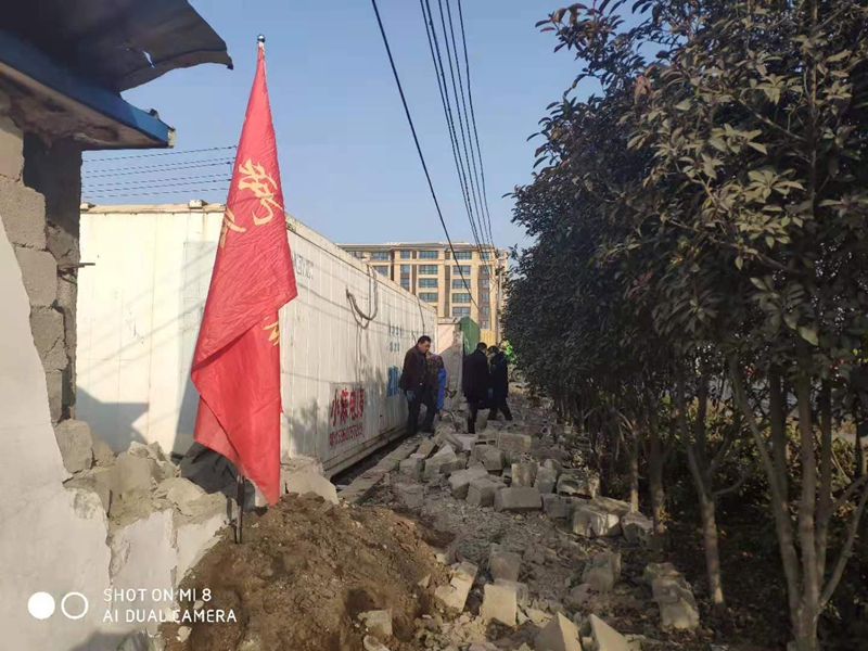 据悉,该处墙头整体倒塌,大多数砖块没有受到损坏。志愿者们一块一块的挑选、清理、搬运,将可以回收利用的砖块整理好,用于墙头的修葺。水泥、沙的配比不太熟悉,天气寒冷如何做好防冻,怎么办?临达公司的退休老党员主动站了出来,为围墙修葺工作做指导,提供帮助。经过两天的奋战,将倒塌的墙头修葺好,并拉好了美化绿布。
