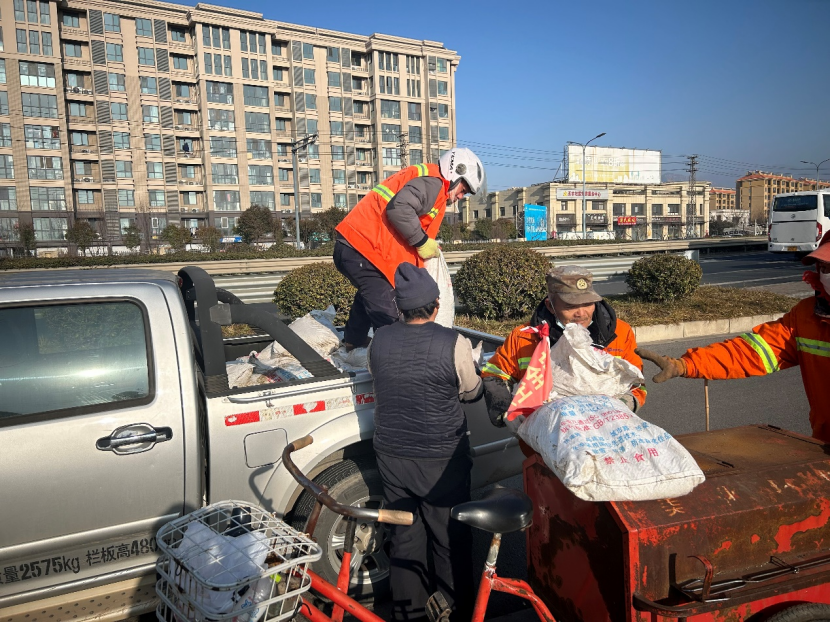 本次任务共出动环卫分公司铲车一辆、自卸车一辆、保洁员工12名,每个班放置融雪剂40袋,历时两个下午时间将九个班共计360余袋融雪剂全部发放到位。