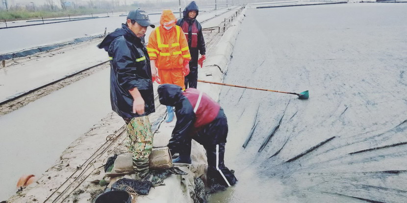 不仅仅是矿盐班组,在海滨钙液滩,老党员、领滩手伏广银、董良平一直坚守在岗,他们不仅干好自己的本职工作,在其他领滩手被居家管控的时刻,他们来到其他单元帮助走水以及其他日常工作,经常一干就是12个小时;在钙液原料水储备池,龚成春每天是按时按点到达滩地,进行滩地巡视,做好巡视登记,没有因为疫情影响而耽误一天,遇上暴风雨等恶劣天气,他就住在值班室,每天晚上要加巡一次,保证仅有的原料水能得到最大化的利用;在钙液销售点,程辉、徐松保响应疫情防控应急预案,备齐医用口罩,酒精,消毒液等防疫物资,每天对前来的钙液运输车进行消毒,对司机进行体温测量、“三码”登记,确保钙液销售安全有序。