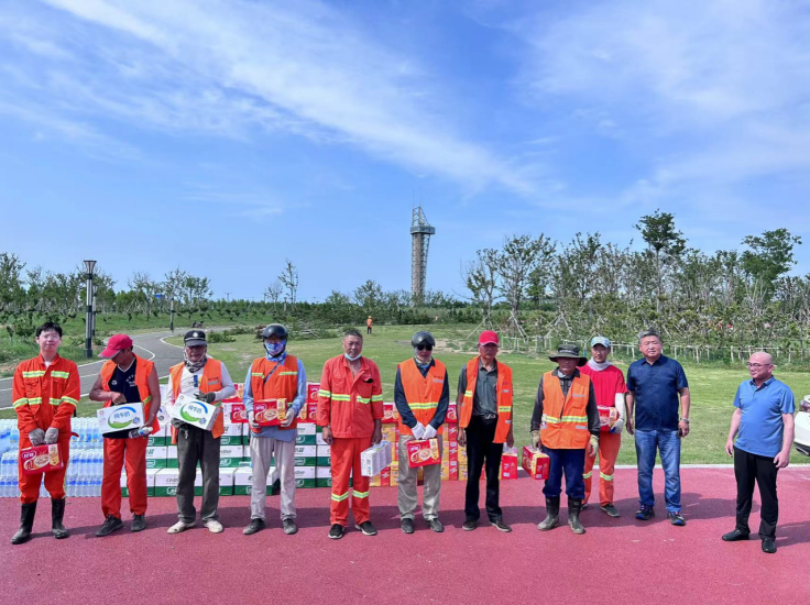 6月25日下午,正值端午假期,夏日骄阳,热浪袭人,绿化工人扛着酷暑奋战在树木移植一线。同时,也牵动着公司领导的心。投资公司党委书记、董事长、总经理庄清付冒着炎炎烈日来到张圩湖公园,走访慰问高温下奋战在一线的广大职工。