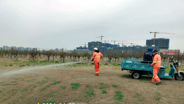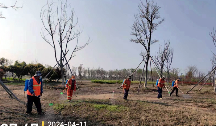 积极浇灌返青水。当前,地温回升快,苗木易萌芽,该班组采用“人工+机械”相结合的方式,全面启动返青水集中浇灌工作,重点对园区乔木、果木、草坪等进行全面灌溉,促进苗木、草坪返青发芽。按照分种类、合理浇灌的原则,采取集中浇灌的方式最大限度减缓昼夜温差对绿化植物的影响,入春后共浇水100余次,对落羽杉圆动力灌根2000棵,对大树浇水1500棵,绿化浇水约30000平方米。