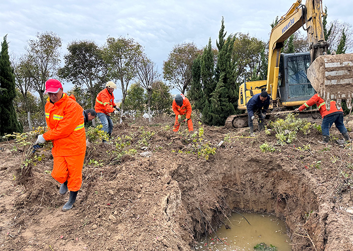 开设道口处的乔木,工人们先用高枝锯和强力剪进行紧密精密修剪,保障后期植物根部能更好的吸收,由于挖掘机太大无法操作,只能全程人工操作,工人们干劲十足,4到5人一组,运送树苗,挖坑、栽植、回填、覆土等步骤有条不紊地进行.并且对这些新移植的苗木和乔木进行灌水和设支撑固定架,经过一天的持续奋战,累计移植50余颗大小树木。(杨雨堃)