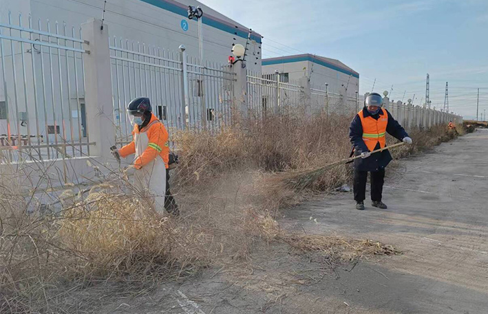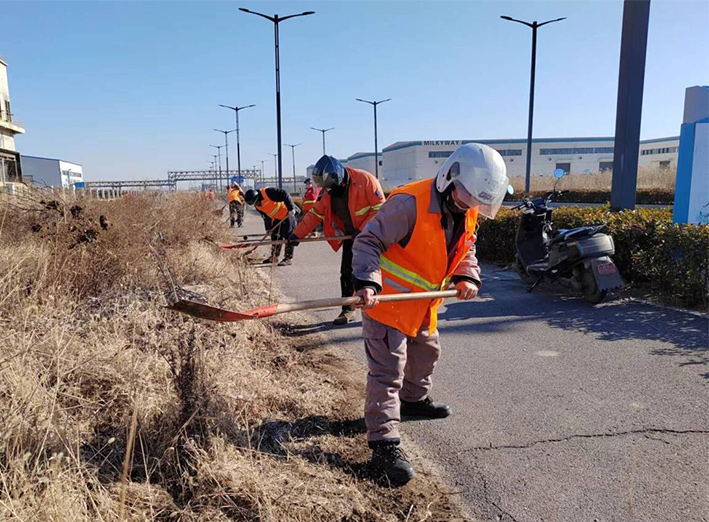 该分公司园区两个班组近35名保洁勇士,无惧低温刺骨天气,汇聚石化十路、石化三道道路两侧。劳动现场,党员骨干示范带头作用处处体现。石峰、朱海勇、杨静身背几十斤重打草机,无所怨言,持续工作时长达三个多少时。在他们的带动下,班组人员一字排开,分工明确,各负其责。