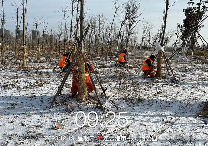为确保园林树木安全越冬,有效巩固园林绿化成果,自11月中旬起,绿化分公司按照“早动员、早部署、早实施”的原则,在管养区域开展了冬季绿地管护提质专项活动,通过浇灌冻水、树木修剪、根颈培土、包裹树干等多项举措有力保证了苗木安全过冬。