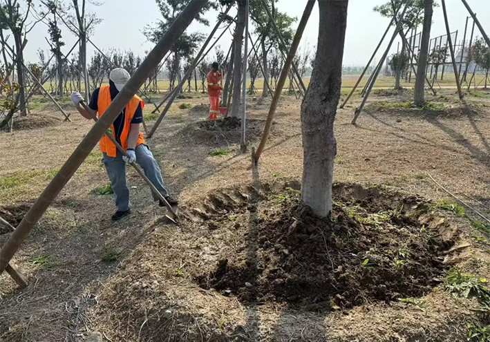 自十月中下旬以来,班组全体成员积极准备,做好抗旱保障工作。每天早晨7点,兵分二路,按照各自分工迅速行动起来。葛承东带领一部分工人对樱花林、红梅林整理树围;田恒亮带领一部分工人施肥浇水,有的同志拎小提桶施肥,有的拿自来水管在后面浇水。为保证水流进树木根系,工作人员采取多种方法让叶片、根系喝足水。为坚决打赢这场抗旱保树木攻坚战,绿化分公司在坚持科学用水、节约用水的前提下,通过科学的修剪植物、抹芽,松土,除草等措施确保苗木安全度过干旱天气。由于抗旱工作启动较早,措施得当,抗旱保苗工作已取得初步成效。目前为止,已经完成7000余棵樱花林和红梅林的施肥、浇水工作。